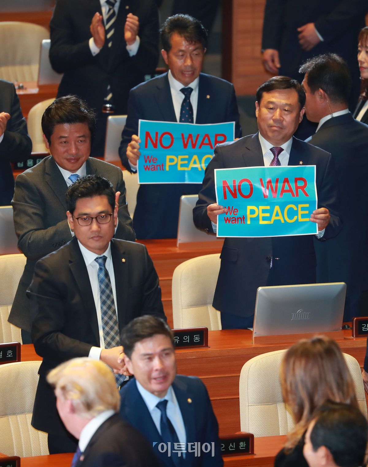 민중당 김종훈, 윤종오 의원이 8일 오전 서울 여의도 국회 본회의장에서 연설을 마치고 퇴장하는 도널드 트럼프 미국 대통령을 향해 'NO WAR, We want PEACE'라고 적힌 피켓을 들어 보이고 있다. 사진공동취재단