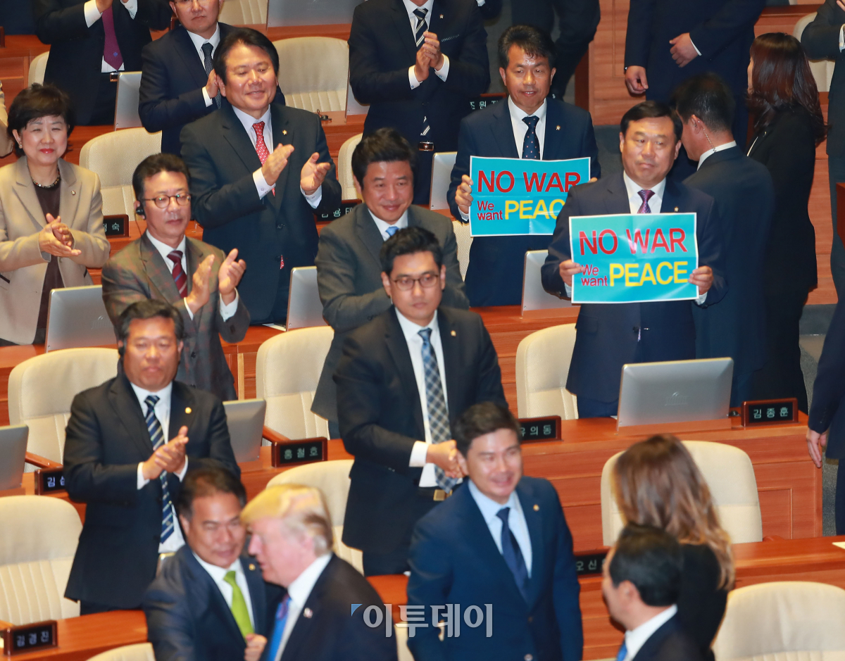 민중당 김종훈, 윤종오 의원이 8일 오전 서울 여의도 국회 본회의장에서 연설을 마치고 퇴장하는 도널드 트럼프 미국 대통령을 향해 'NO WAR, We want PEACE'라고 적힌 피켓을 들어 보이고 있다. 사진공동취재단