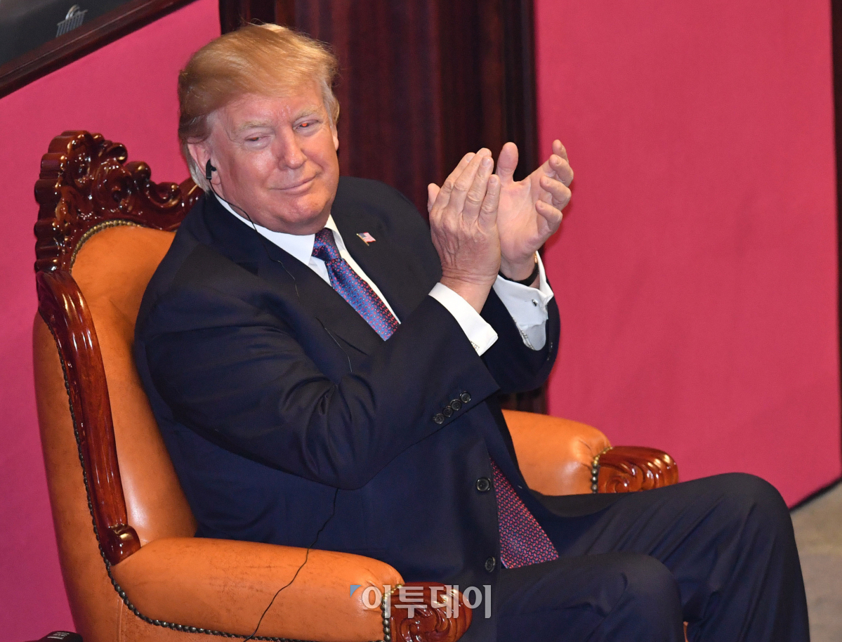 도널드 트럼프 미국 대통령이 방한 이틀째인 8일 오전 서울 여의도 국회 본회의장에서 연설을 하기 전 정세균 국회의장의 인사말을 들으며 박수를 치고 있다. 이번 국회 연설은 미국 역대 대통령 중 7번째로, 1993년 빌 클린턴 대통령에 이어 24년 만이다. 사진공동취재단