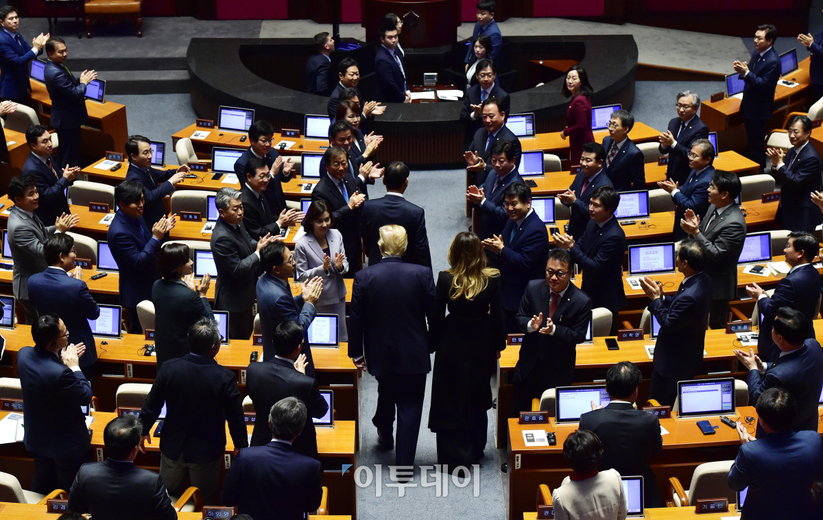 국빈 방문 중인 도널드 트럼프 미국 대통령과 멜라니아 트럼프 여사가 8일 오전 서울 여의도 국회 본회의장으로 들어서고 있다. 이번 국회 연설은 미국 역대 대통령 중 7번째로, 1993년 빌 클린턴 대통령에 이어 24년 만이다. 사진공동취재단