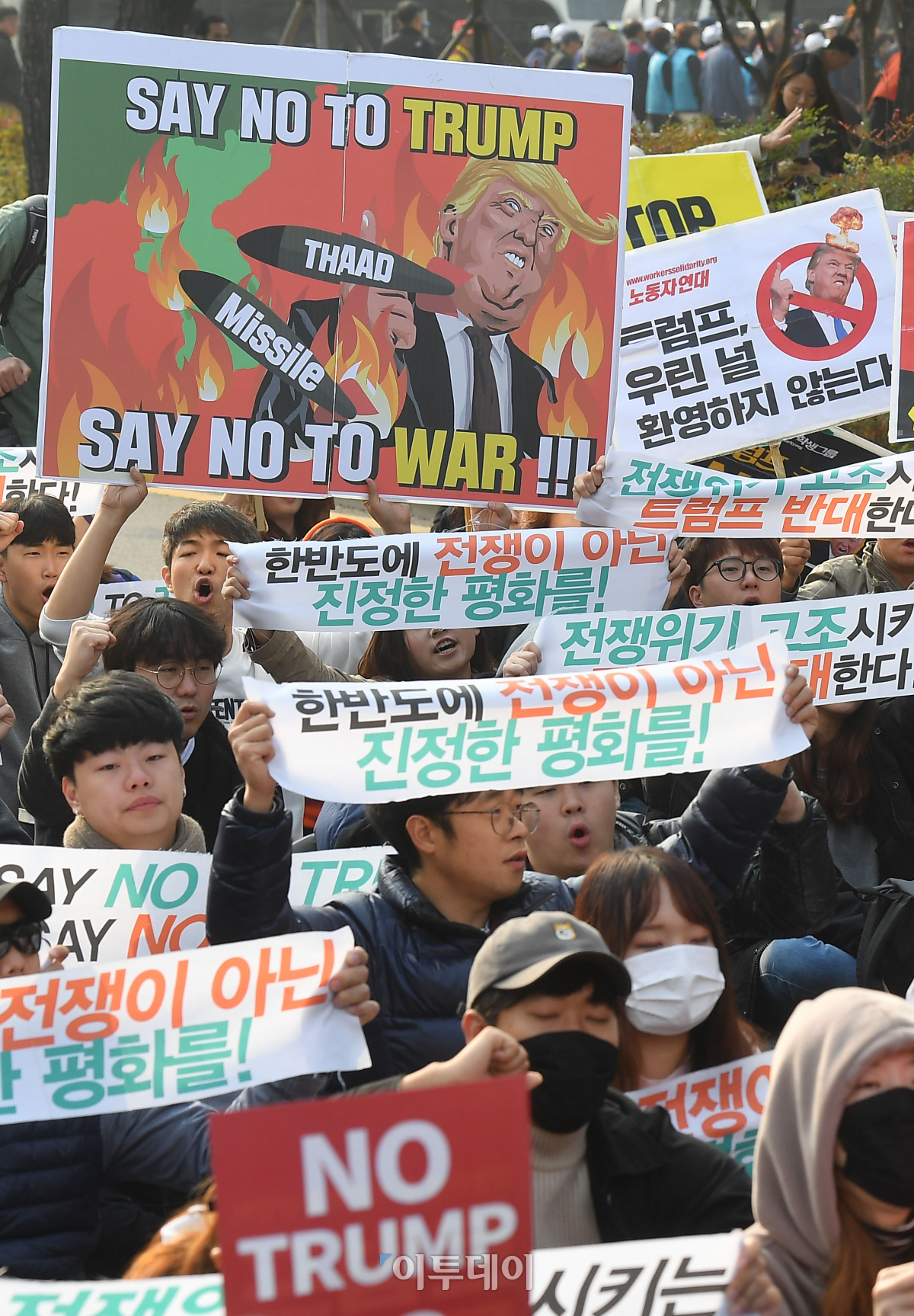 트럼프 대통령의 국회 연설일인 8일 오전 서울 여의도 국회 앞에서 시민 사회 단체로 구성된 'NO트럼프 공동행동'관계자들이 트럼프 국회연설을 규탄하는 구호를 외치고 있다. 이동근 기자 foto@