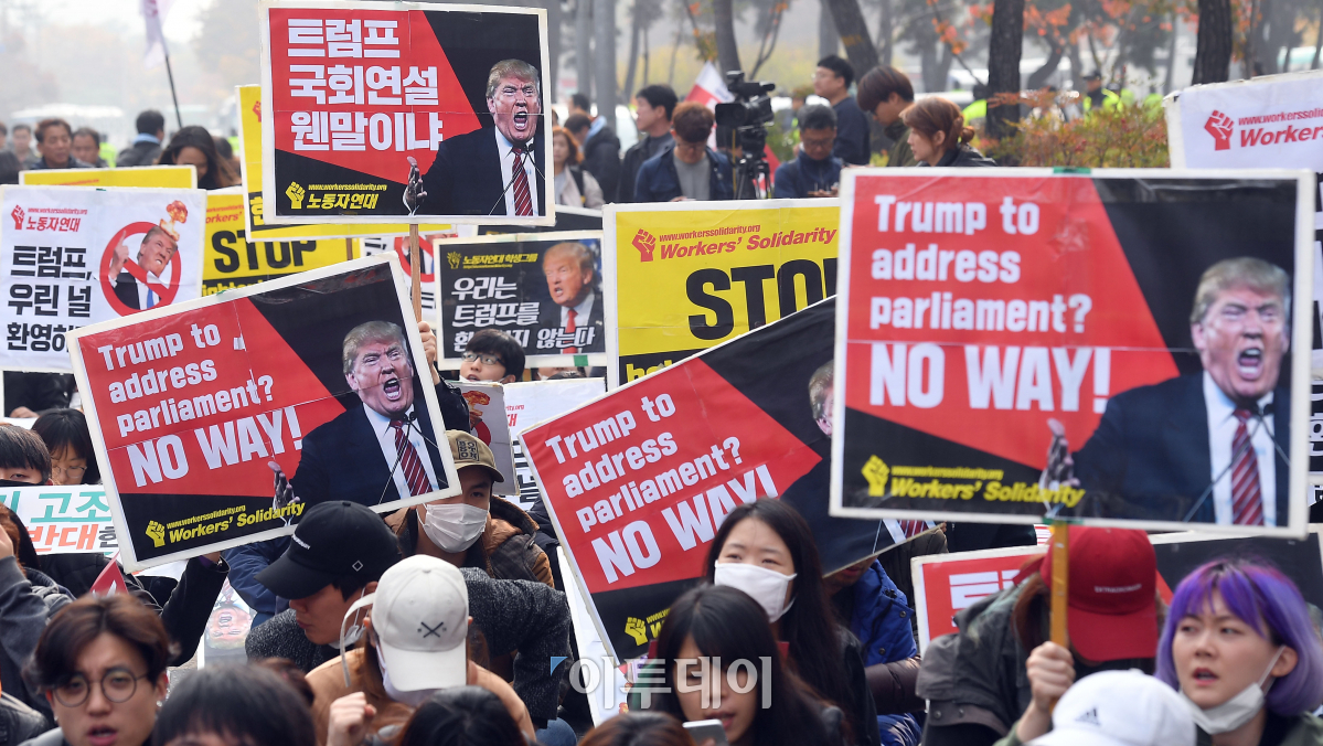 트럼프 대통령의 국회 연설일인 8일 오전 서울 여의도 국회 앞에서 시민 사회 단체로 구성된 'NO트럼프 공동행동'관계자들이 트럼프 국회연설을 규탄하는 구호를 외치고 있다. 이동근 기자 foto@