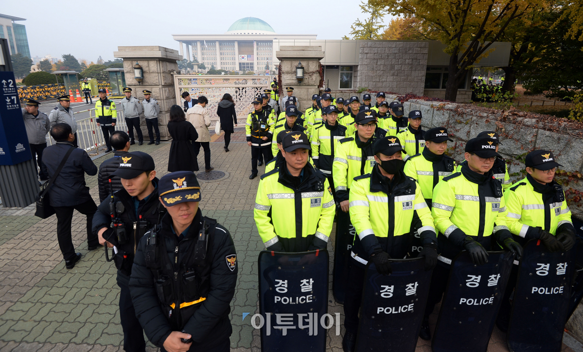 트럼프 대통령의 국회 연설일인 8일 오전 서울 여의도 국회 인근에서 트럼프 반대와 환영 집회가 예정된 가운데 경찰이 국회 주변 경계를 강화하고 있다. 이동근 기자 foto@