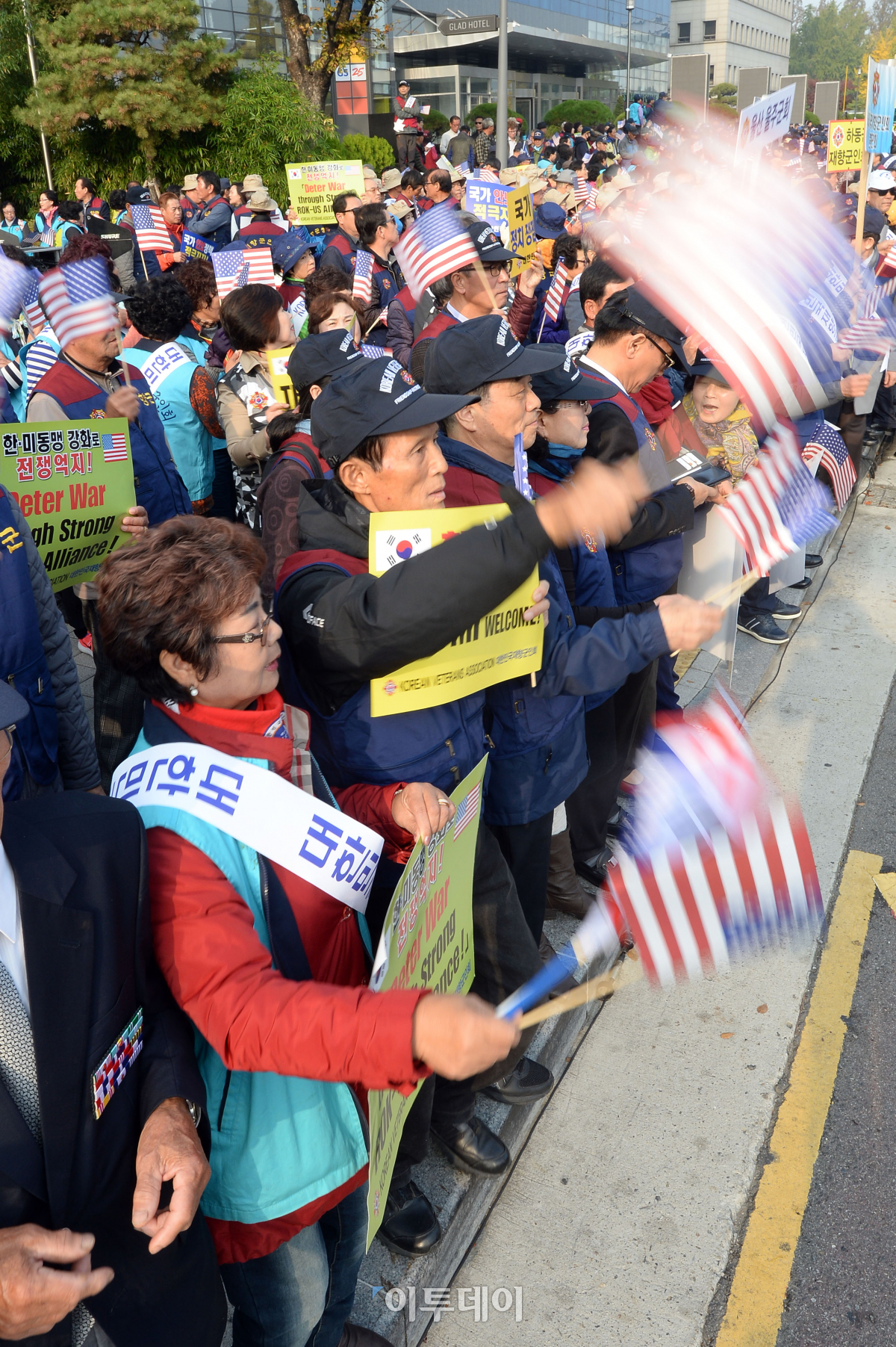 트럼프 대통령의 국회 연설일인 8일 오전 서울 여의도 글래드호텔 앞에서 재향군인회 회원들이 트럼프 대통령 환영집회를 열고 성조기를 흔들며 한미동맹 강화를 촉구하고 있다. 이동근 기자 foto@