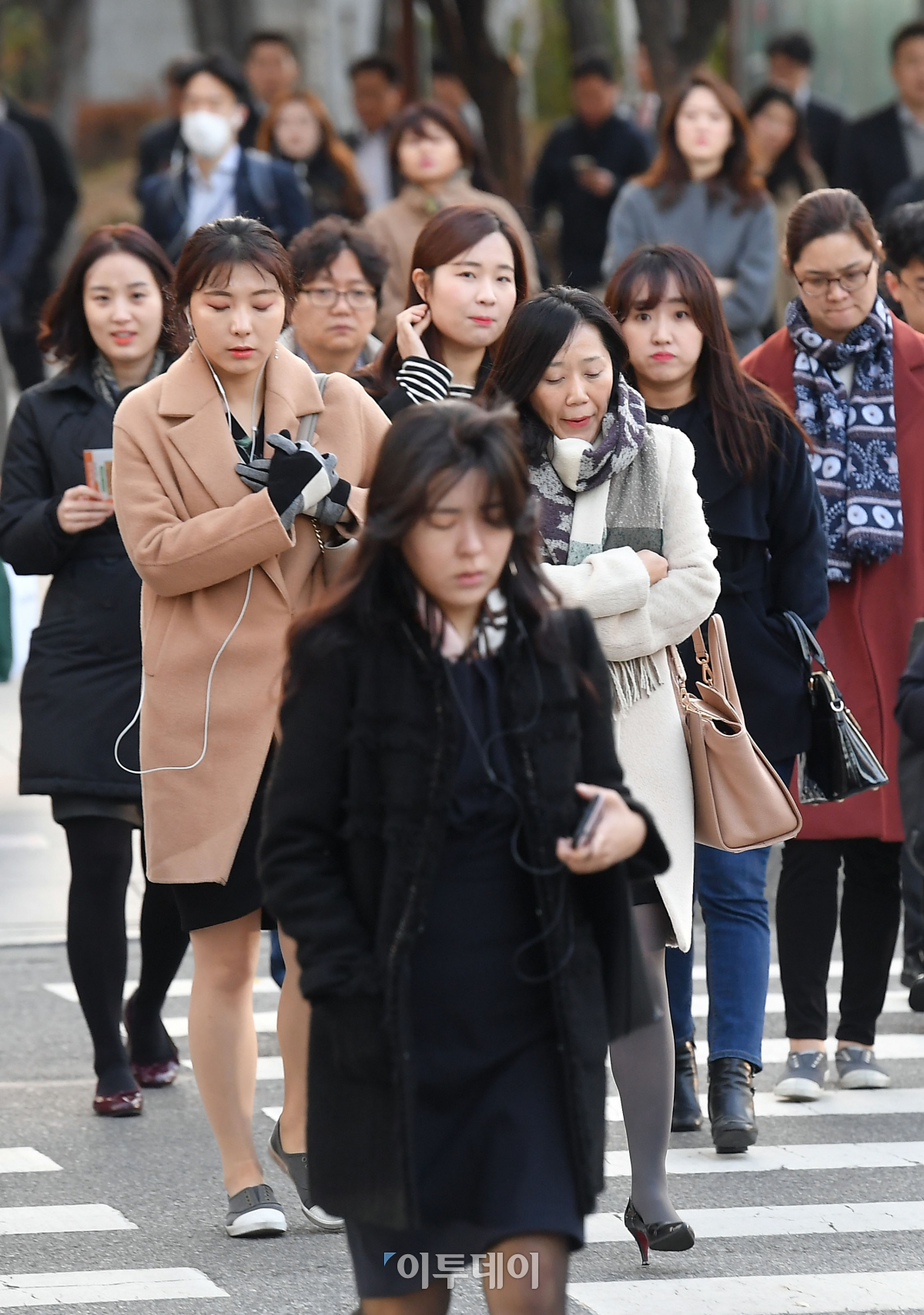 중부내륙과 전북,경북 북부 내륙지방에 올 가을들어 첫 한파특보가 발효된 9일 오전 서울 여의도역 인근에서 시민들이 두터운 외투와 스카프를 두른 채 발걸음을 재촉하고 있다. 기상청은 오후부터 따뜻한 남서풍이 불며 평년기온을 회복해 한파특보는 해제될 것으로 예보했다. 이동근 기자 foto@