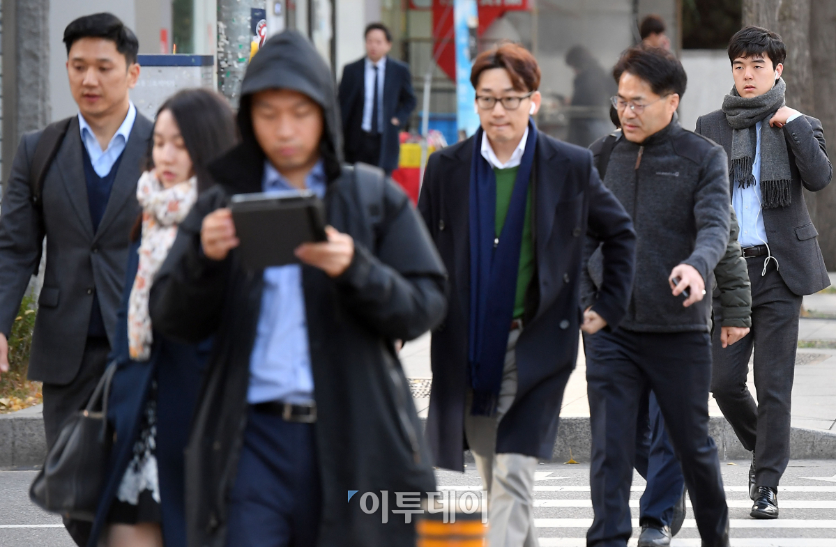 중부내륙과 전북,경북 북부 내륙지방에 올 가을들어 첫 한파특보가 발효된 9일 오전 서울 여의도역 인근에서 시민들이 두터운 외투와 스카프를 두른 채 발걸음을 재촉하고 있다. 기상청은 오후부터 따뜻한 남서풍이 불며 평년기온을 회복해 한파특보는 해제될 것으로 예보했다. 이동근 기자 foto@