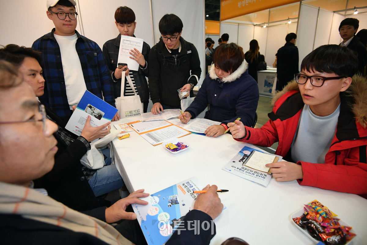 '청년층 일자리 창출을 위한 녹색기업 리크루팅'이 9일 경기 고양시 킨텍스에서 열린 가운데 취업준비생들이 상담을 받고 있다. 경기도가 환경분야 취업희망자들의 진로설계를 돕기 위해 개최한 이번 설명회는 도내 우수 환경기업 20곳이 참가하며, 1:1 채용상담을 통해 우수 인재는 현장에서 면접을 통해 즉시 채용한다. 이동근 기자 foto@
