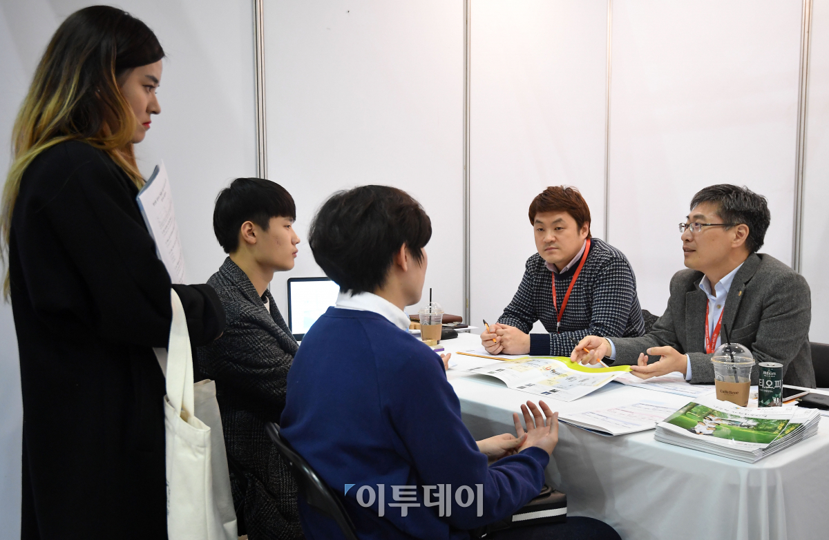 '청년층 일자리 창출을 위한 녹색기업 리크루팅'이 9일 경기 고양시 킨텍스에서 열린 가운데 취업준비생들이 상담을 받고 있다. 경기도가 환경분야 취업희망자들의 진로설계를 돕기 위해 개최한 이번 설명회는 도내 우수 환경기업 20곳이 참가하며, 1:1 채용상담을 통해 우수 인재는 현장에서 면접을 통해 즉시 채용한다. 이동근 기자 foto@