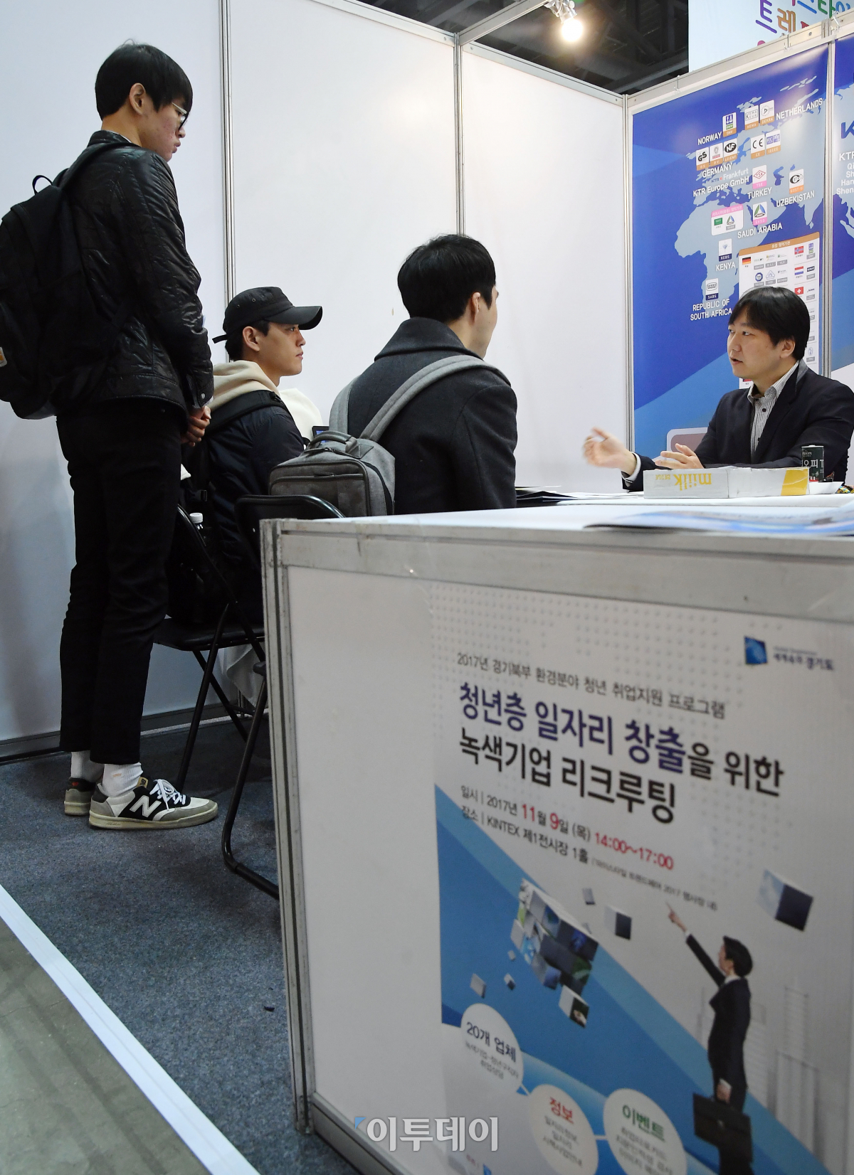 '청년층 일자리 창출을 위한 녹색기업 리크루팅'이 9일 경기 고양시 킨텍스에서 열린 가운데 취업준비생들이 상담을 받고 있다. 경기도가 환경분야 취업희망자들의 진로설계를 돕기 위해 개최한 이번 설명회는 도내 우수 환경기업 20곳이 참가하며, 1:1 채용상담을 통해 우수 인재는 현장에서 면접을 통해 즉시 채용한다. 이동근 기자 foto@