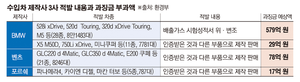 BMW코리아·메르세데스-벤츠코리아·포르쉐코리아 등 수입 자동차 업체 3곳이 배출가스 시험성적서 위·변조, 부품 바꿔치기를 한 사실이 드러나면서 해당 차량에 대한 대규모 리콜(결함시정 명령)로 이어질지 주목된다.