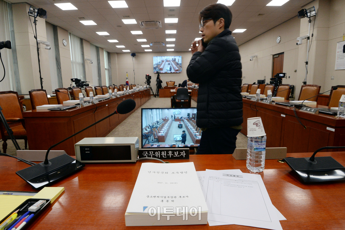 문재인정부 1기 내각의 마지막 조각으로 홍종학 중소벤처기업부 장관 후보자 임명동의안 심사를 위한 인사청문회가 10일 오전 서울 여의도 국회에서 열린다. 이날 관계자들이 청문회 준비를 하고 있다. 이동근 기자 foto@