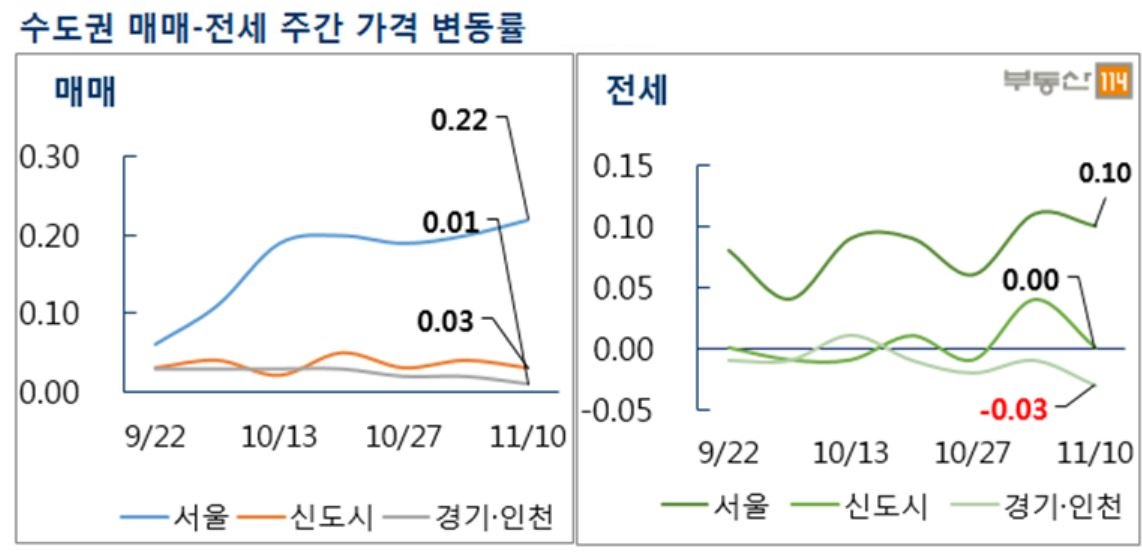 11일 부동산114에 따르면 11월 둘째 주 서울 아파트 매매가격 변동률은 8·2대책 이후 가장 높은 상승률인 0.22%로 집계됐다. 재건축 아파트가 0.29% 올라 지난주 0.21%에 비해 상승폭이 커졌고 일반 아파트는 0.20% 올랐다. 신도시와 경기·인천은 각각 0.03%, 0.01%의 소폭 상승을 보였다.