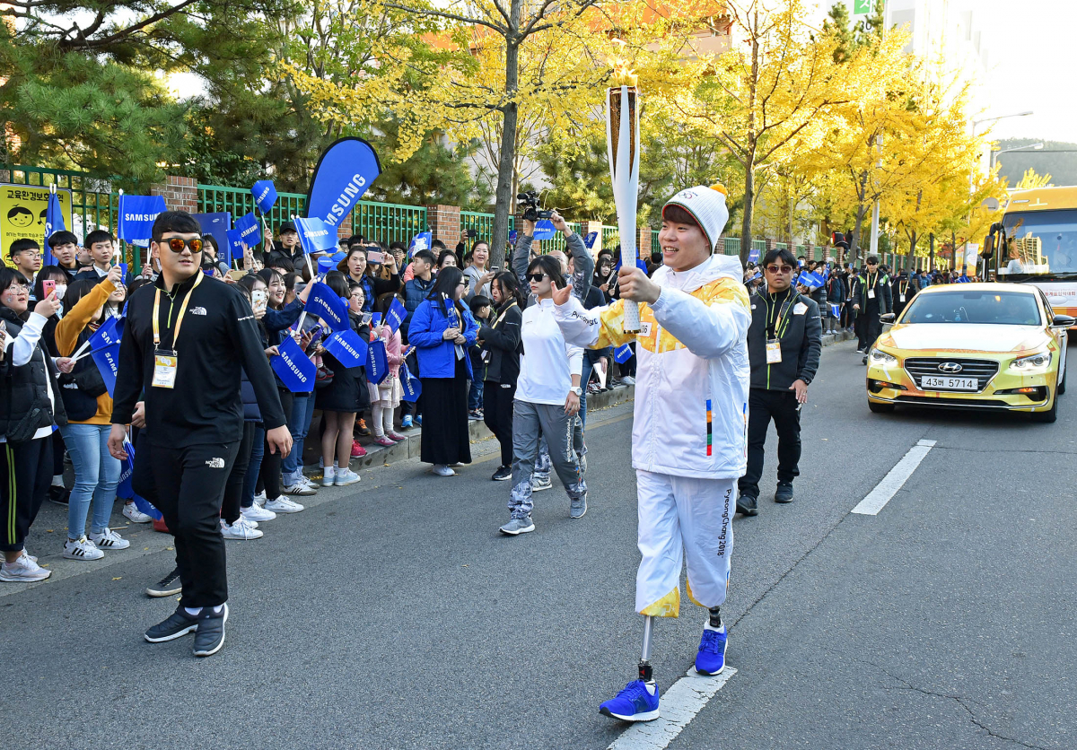 2018 평창동계올림픽 성화봉송 공식후원사인 삼성전자는 11일 경남 김해에서 ‘로봇다리 수영 선수’로 알려진 전 장애인 수영 국가대표 김세진 선수, 전국장애인수영대회서 신인선수상을 받은 경운중학교 김동훈 선수와 함께 희망의 성화봉송을 펼쳤다고 밝혔다.