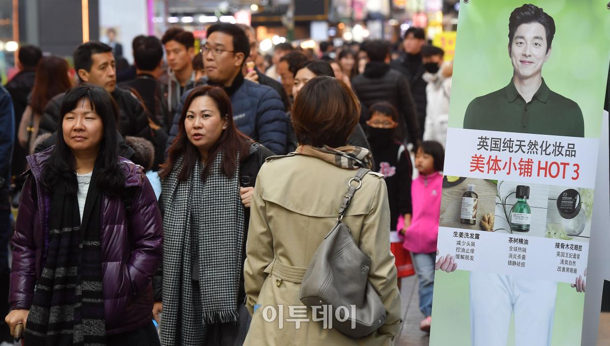 한-중 정상이 양국 관계복원을 공식화 함에 따라 양국 사이에 최대 걸림돌이던 사드 갈등에 마침표를 찍었다. 이에 사드보복의 직격탄을 맞았던 관광, 유통업계 등 관련업계는 유커(遊客·중국인 단체 관광객)가 돌아올 것이란 기대속에 손님 맞을 준비에 박차를 가하고 있다. 12일 서울 명동의 한 상점 앞에 중국어로 된 광고 배너가 세워져 있다. 이동근 기자 foto@