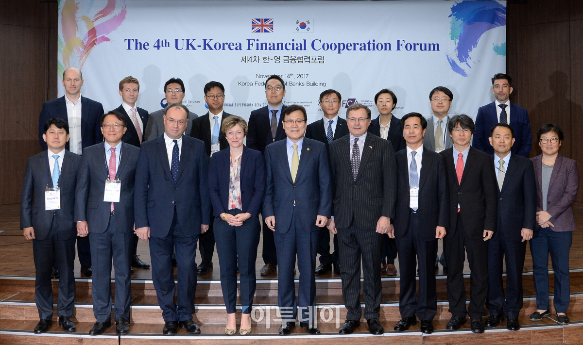 최종구(앞줄 왼쪽에서 다섯 번째 ) 금융위원장, 캐서린 브래딕(앞줄 왼쪽에서 네 번째)영국 재무부 차관보, 앤드류 베일리(앞줄 왼쪽에서 세 번째) 영국 금융행위감독청장이 14일 오전 서울 중구 은행회관에서 열린 제4차 한-영 금융협력포럼에서 참석자들과 기념촬영을 하고 있다. 이동근 기자 foto@