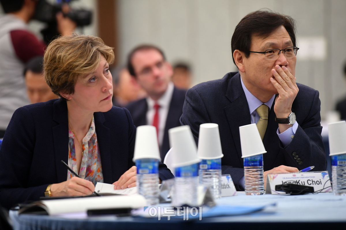 최종구(오른쪽) 금융위원장과 캐서린 브래딕 영국 재무부 차관보가 14일 오전 서울 중구 은행회관에서 열린 제4차 한-영 금융협력포럼에서 앤드류 베일리 영국 금융행위감독청장의 기조연설을 듣고 있다. 이동근 기자 foto@