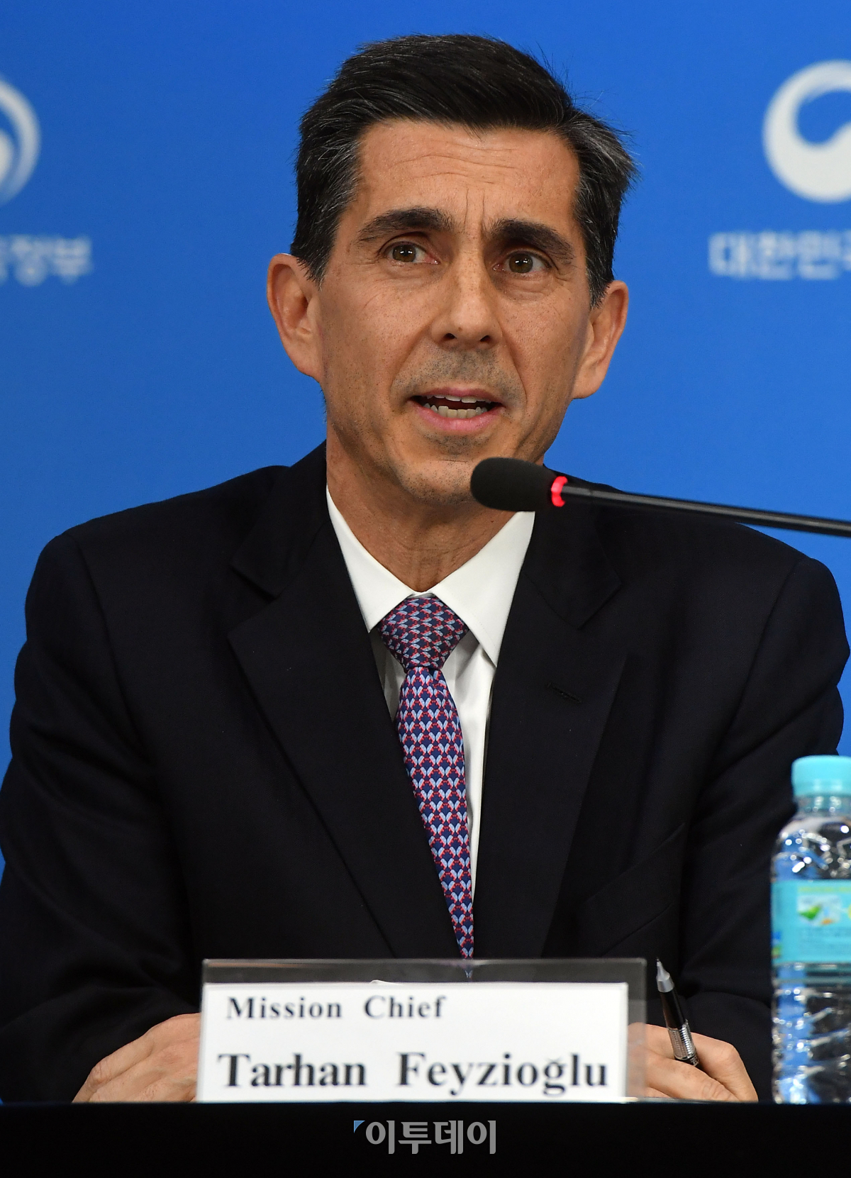 타르한 페이지오글루 IMF 한국 미션단장이 14일 서울 종로구 정부서울청사에서 한국 정부와의 연례협의 결과를 발표하고 있다. 이동근 기자 foto@
