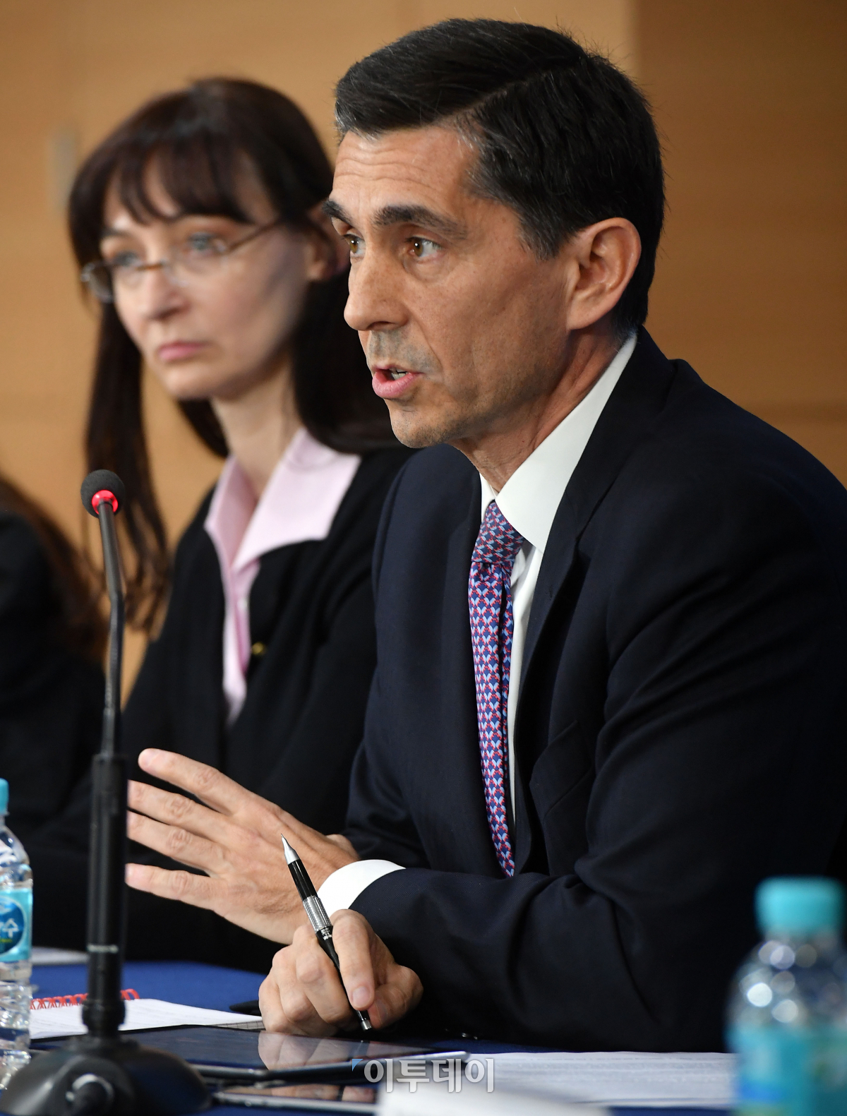 타르한 페이지오글루 IMF 한국 미션단장을 비롯한 국제통화기금(IMF) 협의단이 14일 서울 종로구 정부서울청사에서 한국 정부와의 연례협의 결과를 발표하고 있다. 이동근 기자 foto@