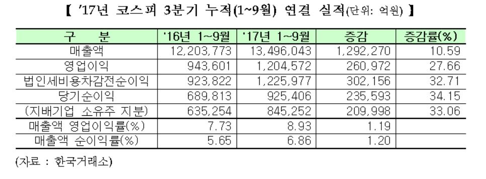 15일 한국거래소와 한국상장회사협의회가 발표한 유가증권시장 12월 결산법인 525사(금융사 제외)의 3분기결산실적 분석(연결재무제표 기준) 자료에 따르면 코스피 상장기업들은 올해 3분기까지 1350조원의 누적 매출액과 120조원의 누적 영업이익을 기록했다. 이는 전년 동기대비 각각 10.59%, 27.66% 증가한 수치다. 당기순이익은 전년 대비 34.15% 늘어난 93조 원으로 큰 폭으로 증가했다.