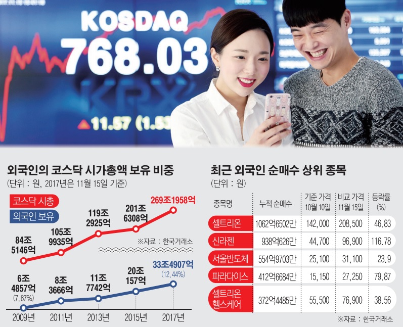 ◇외국인 코스닥 보유 비중 12.44%로 ‘껑충’ = 코스닥에서 차익실현 매물을 내놓던 외국인도 최근 4거래일간 총 4876억 원을 매수하며 보폭을 맞추는 중이다. 외국인이 코스닥 시장에서 1000억 원 이상의 순매수를 연일 지속한 사례도 이번이 처음이다. 글로벌 금융위기 이후 8~11% 수준을 유지하던 외국인의 코스닥 보유비중은 15일 기준으로 12.44%까지 올랐다. 외국인은 주로 셀트리온, 신라젠, 바이로메드 등 바이오주를 집중적으로 사들였는데, 이들 종목은 모두 시장수익률 이상의 상승률을 기록했다.