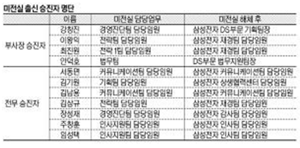 또 전무 승진자에는 미전실 출신 서동면, 김기원, 김남용, 김상규, 장성재, 주창훈, 임성택 상무가 포함됐다. 미전실 커뮤니케이션팀 출신에는 서동면 전무ㆍ김남용 전무, 인사지원팀 출신으로는 주창훈 전무ㆍ임성택 전무, 기획팀 출신에는 김기원 전무, 전략팀 출신 김상규 전무, 경영진단팀 출신에는 장성재 전무가 있다. 특히 임성택 전무와 주창훈 전무는 정현호 사장이 미전실 인사지원팀 팀장으로 있을 당시 함께 일했다.