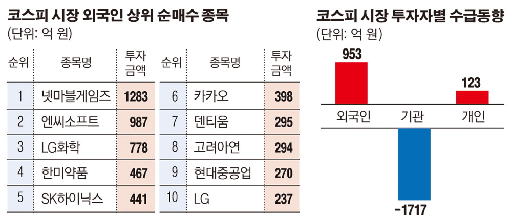 이번주 외국인의 매수세가 가장 강했던 종목은 넷마블게임즈였다. 외국인은 이번주 들어 넷마블게임즈 주식을 1283억 원어치 사들였다. 넷마블게임즈는 ‘리니지2: 레볼루션’ 흥행 기대감에 13일 52주 신고가를 기록한 바 있다. 다음으로 외국인들이 많이 산 종목은 △엔씨소프트(987억 원) △LG화학(778억 원) △한미약품(467억 원) △SK하이닉스(441억 원) △카카오(398억 원) △덴티움(295억 원) △고려아연(294억 원) △현대중공업(270억 원) △LG(237억 원) 순이었다.