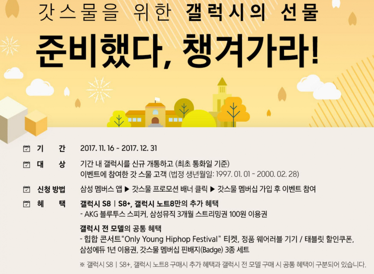 특히 삼성전자는 대규모 힙합 공연 ‘온리 영 힙합페스티벌(Only Young Hiphop Festival)’ 추첨을 통해 갓스물 고객 1500명(1인 2매)을 초청할 계획이다. 도끼, 더 콰이엇, 넉살 등이 출연하는 이번 공연은 2018년 1월20일 부산, 2월24일 서울에서 열릴 예정이다.