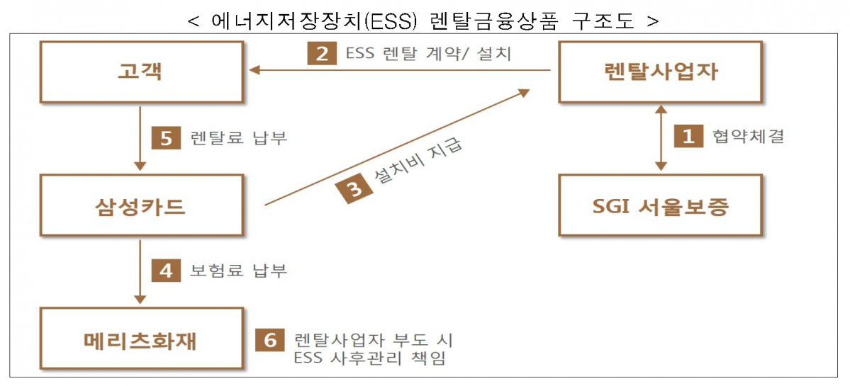 이 상품은 임대사업자가 삼성카드로부터 ESS 설치자금을 빌려 고객에게 ESS를 설치(임대)해주고, 고객은 절감된 전기요금을 활용해 렌탈료만 매달 납부하는 방식으로 운영된다.