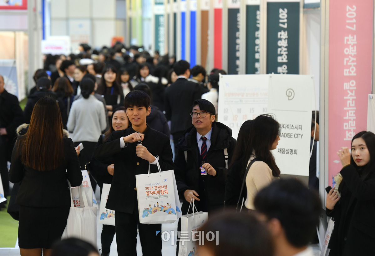 2017 관광산업 일자리박람회가 21일 서울 서초구 aT센터에서 열린 가운데 행사장이 구직자들로 북적이고 있다. 문화체육관광부가 주최하는 이번 박람회는 ‘행복한 관광, 즐거운 일자리’라는 주제로 청년 구직자에게 관광 분야의 다양한 일자리를 소개한다. 이동근 기자 foto@