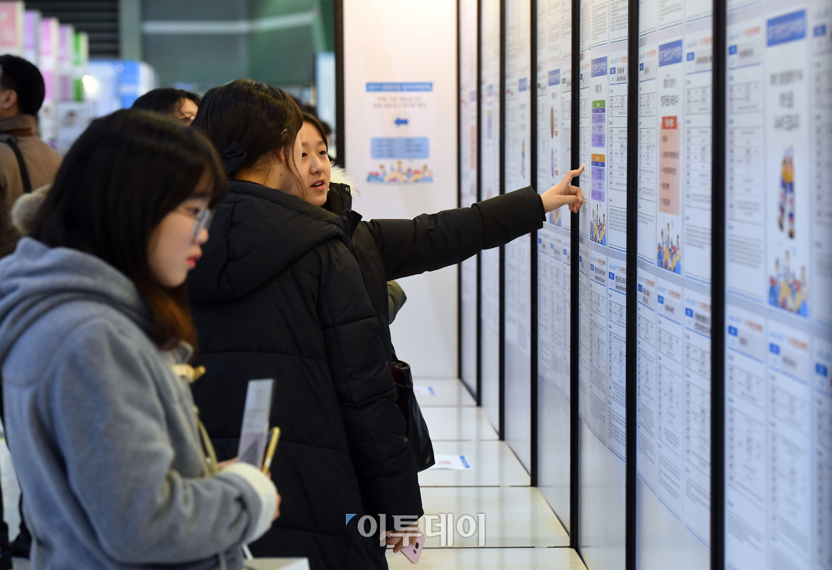 2017 관광산업 일자리박람회가 21일 서울 서초구 aT센터에서 열린 가운데 취업준비생들이 채용게시판을 살펴보고 있다. 문화체육관광부가 주최하는 이번 박람회는 ‘행복한 관광, 즐거운 일자리’라는 주제로 청년 구직자에게 관광 분야의 다양한 일자리를 소개한다. 이동근 기자 foto@
