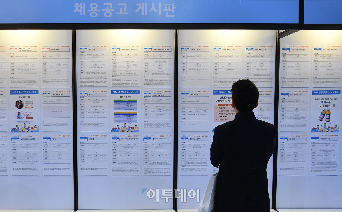 2017 관광산업 일자리박람회가 21일 서울 서초구 aT센터에서 열린 가운데 한 구직자가 채용게시판을 살펴보고 있다. 문화체육관광부가 주최하는 이번 박람회는 ‘행복한 관광, 즐거운 일자리’라는 주제로 청년 구직자에게 관광 분야의 다양한 일자리를 소개한다. 이동근 기자 foto@