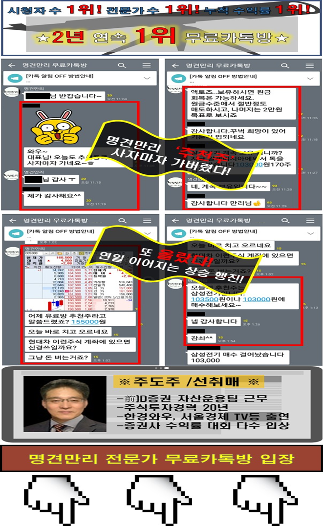 시름시름 내려가만 가던 내 계좌 무료카톡방을 만나고 달라 졌다. 전문가의 장중 실시간 종목 분석, 추천주 공개까지! 35만 명의 투자자가 선택한 2년 연속 업계 1위의 전문가 카톡방을 만난 뒤 계좌가 복구 됐다. 주식에 대한 모든 정보 무료카톡방에서 확인해보자. 아직 입장을 하니 않았다면 서둘러 입장해보자.