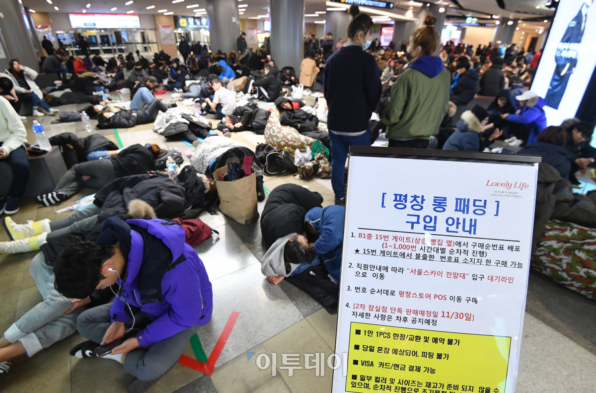 22일 오전 서울 송파구 롯데백화점 잠실점 에비뉴엘 지하 입구 앞에서 '평창 롱패딩'을 구입하기 위해 밤을 샌 시민들이 번호표 발급을 기다리고 있다. 이날 잠실점에서 판매되는 롱패딩은 1000벌이며 오는 24일 부산·대구·대전 등 10개 점포, 30일 잠실점 에비뉴엘에서 추가 판매될 예정이다. 이동근 기자 foto@
