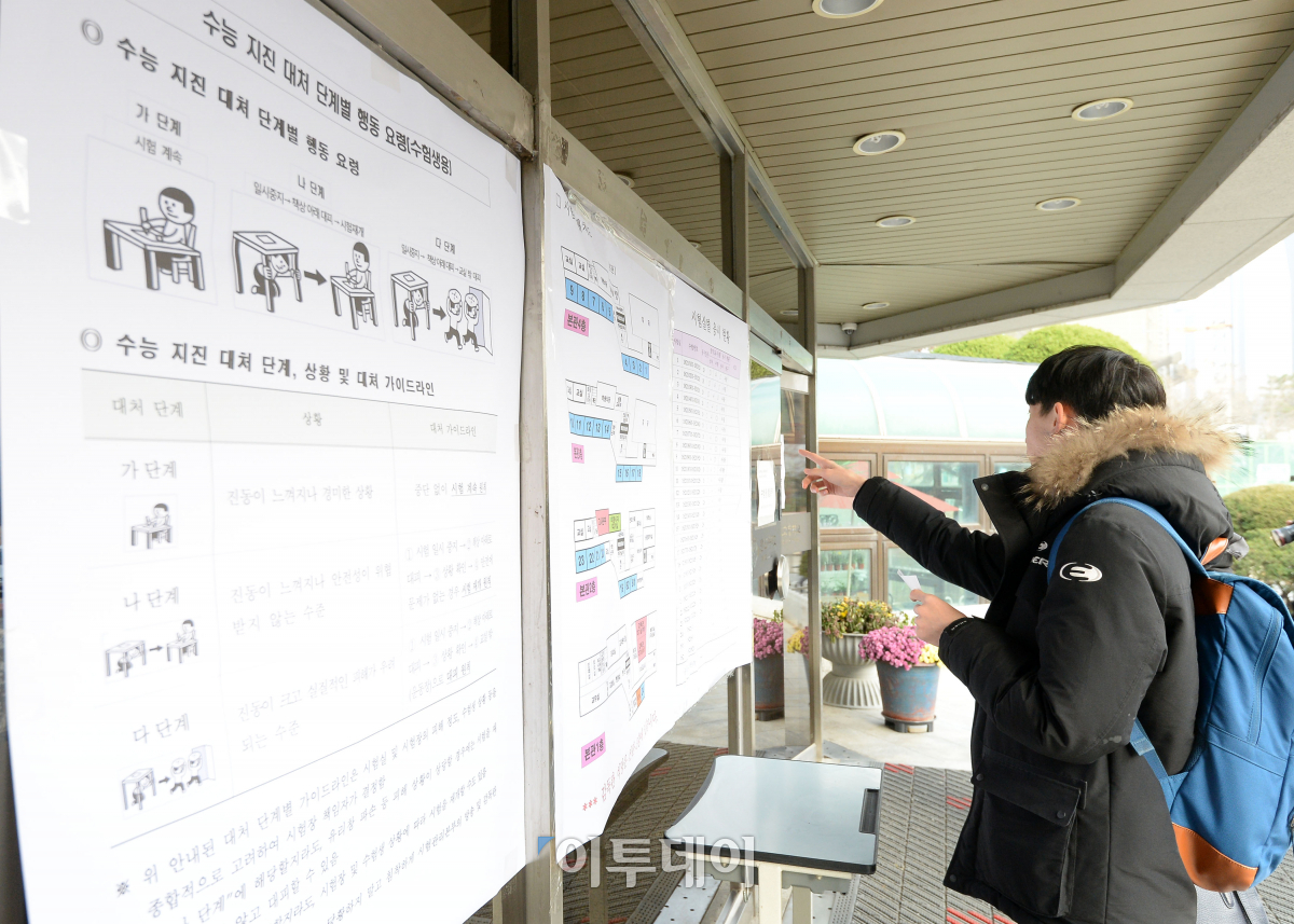 2018학년도 대학수학능력시험 예비소집일인 22일 오후 서울 서초구 반포고등학교에서 수험생이 시험장 위치와 지진 대처 행동 요령 안내문을 살펴보고 있다. 이동근 기자 foto@