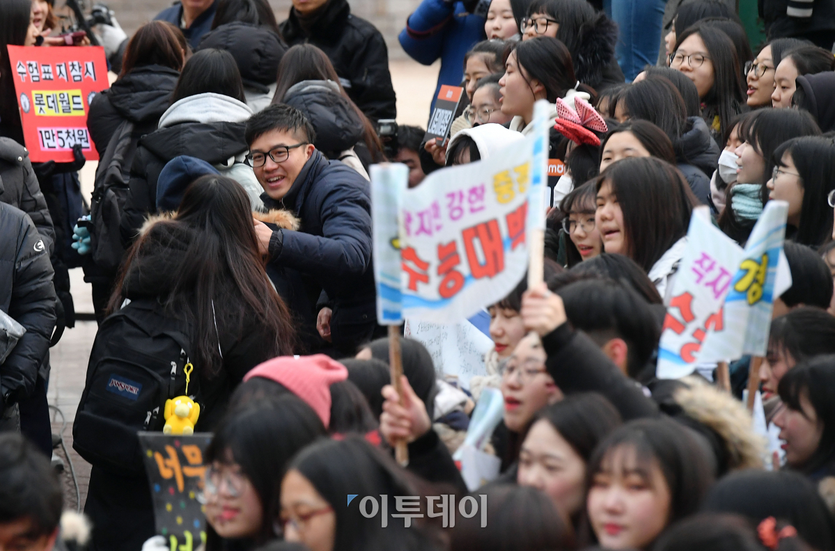 2018학년도 대학수학능력시험일인 23일 오전 서울 중구 이화여자외국어고등학교에서 수험생들이 후배들의 응원을 받으며 시험장으로 향하고 있다. 이동근 기자 foto@