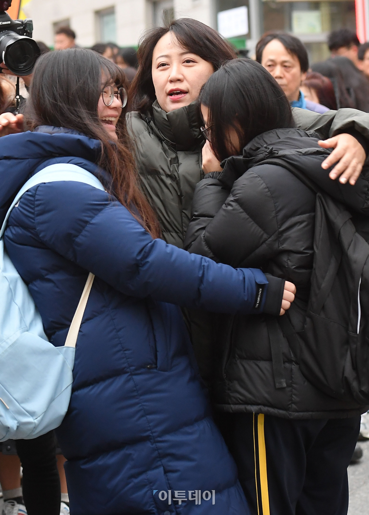 2018학년도 대학수학능력시험일인 23일 오전 서울 중구 이화여자외국어고등학교에서 선생님이 수험생들을 안아주며 응원하고 있다. 이동근 기자 foto@