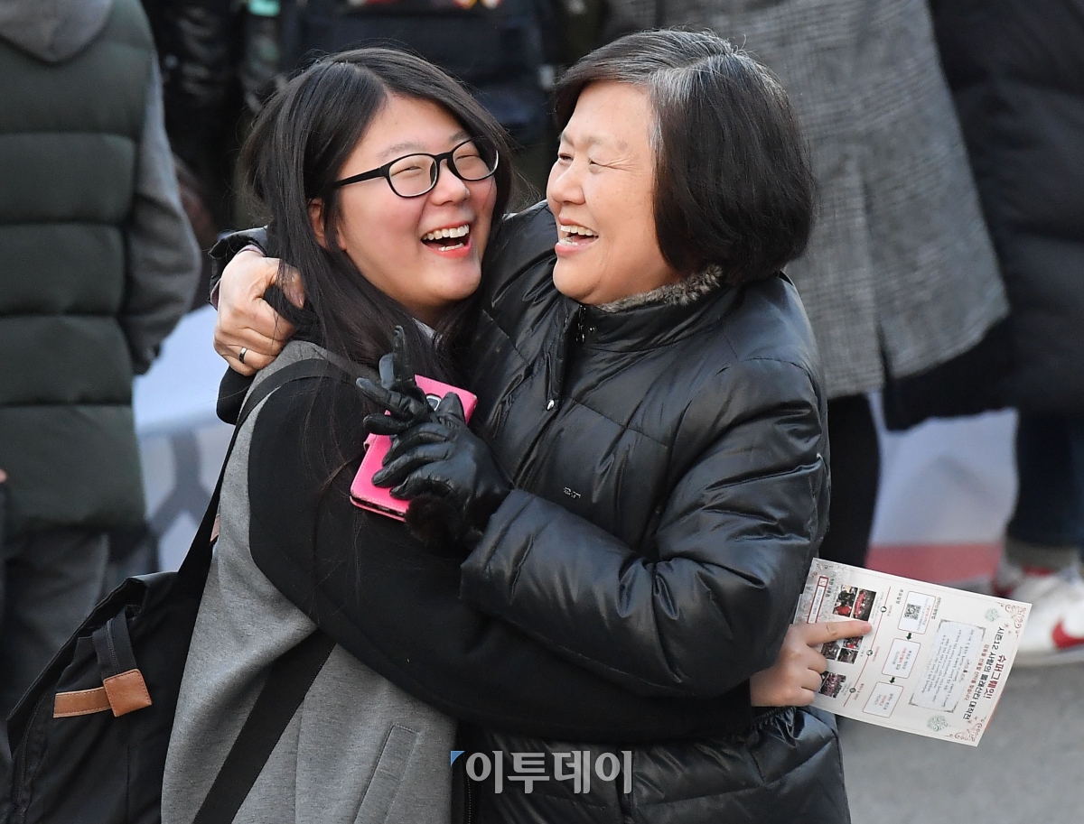 2018학년도 대학수학능력시험일인 23일 서울 중구 이화외고에서 수능을 마친 수험생들이 밝은 표정으로 엄마와 포옹하고 있다. 이동근 기자 foto@