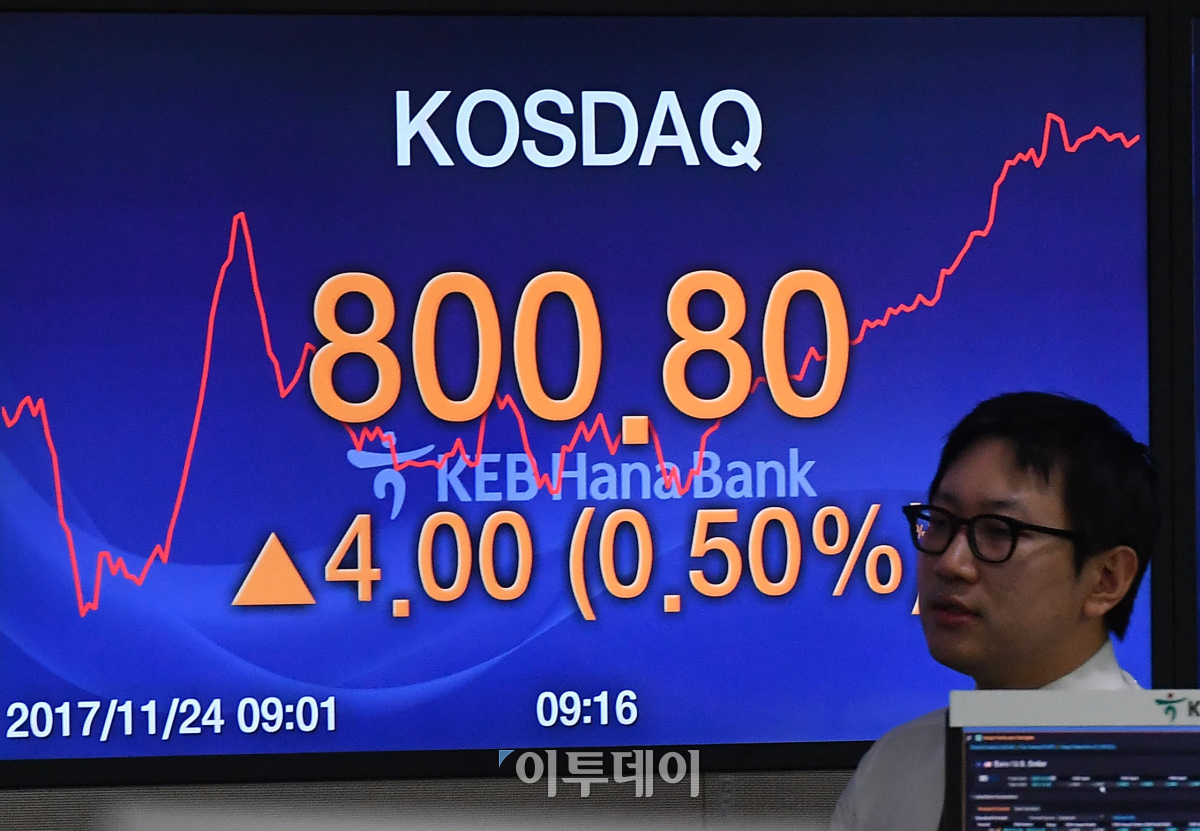 상승세의 코스닥 지수가 10년만에 800선을 돌파했다. 24일 오전 서울 을지로 KEB하나은행 딜링룸 전광판에 코스닥 지수가 전 거래일 종가보다 4.00포인트 오른 800.80을 나타내고 있다. 이동근 기자 foto@