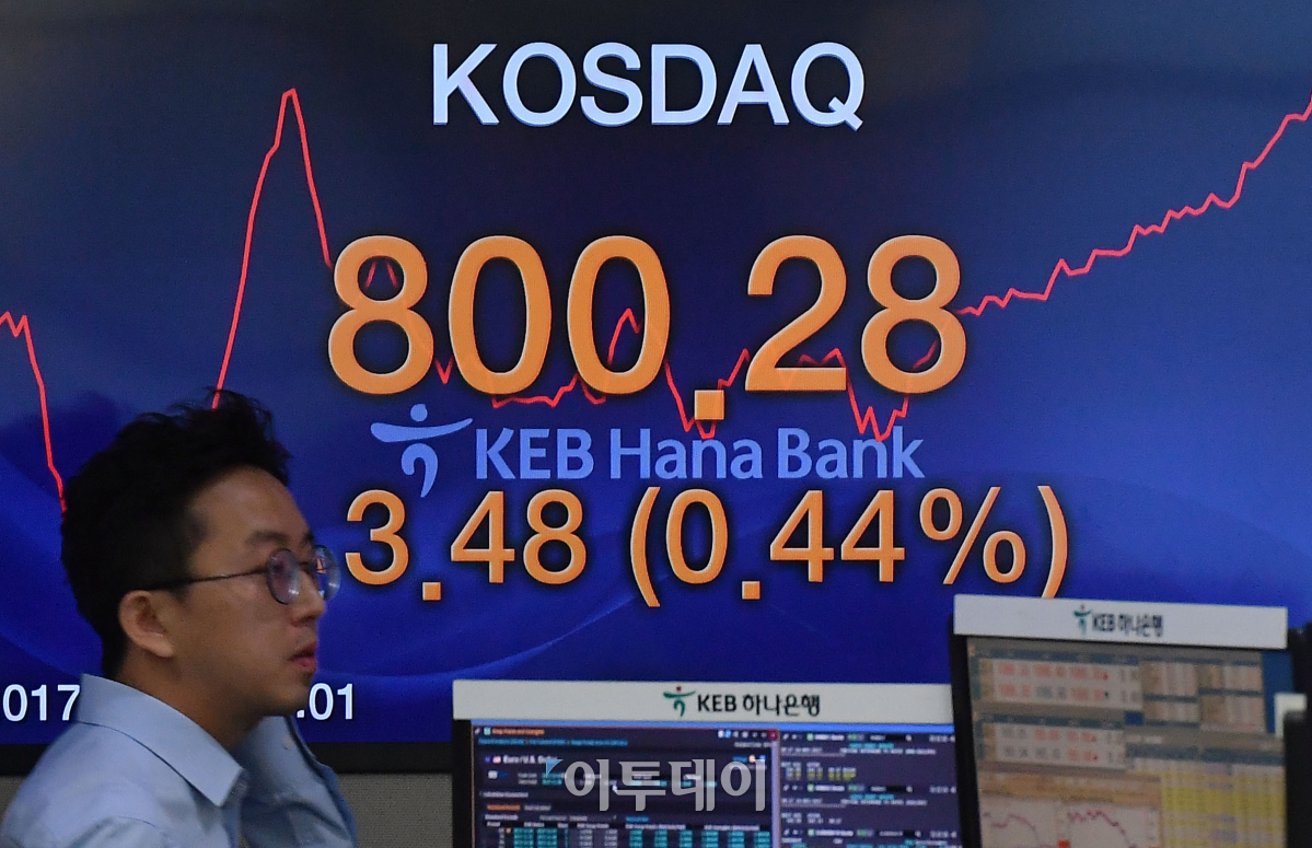 상승세의 코스닥 지수가 10년만에 800선을 돌파했다. 24일 오전 서울 을지로 KEB하나은행 딜링룸 전광판에 코스닥 지수가 전 거래일 종가보다 3.48포인트 오른 800.28을 나타내고 있다. 이동근 기자 foto@