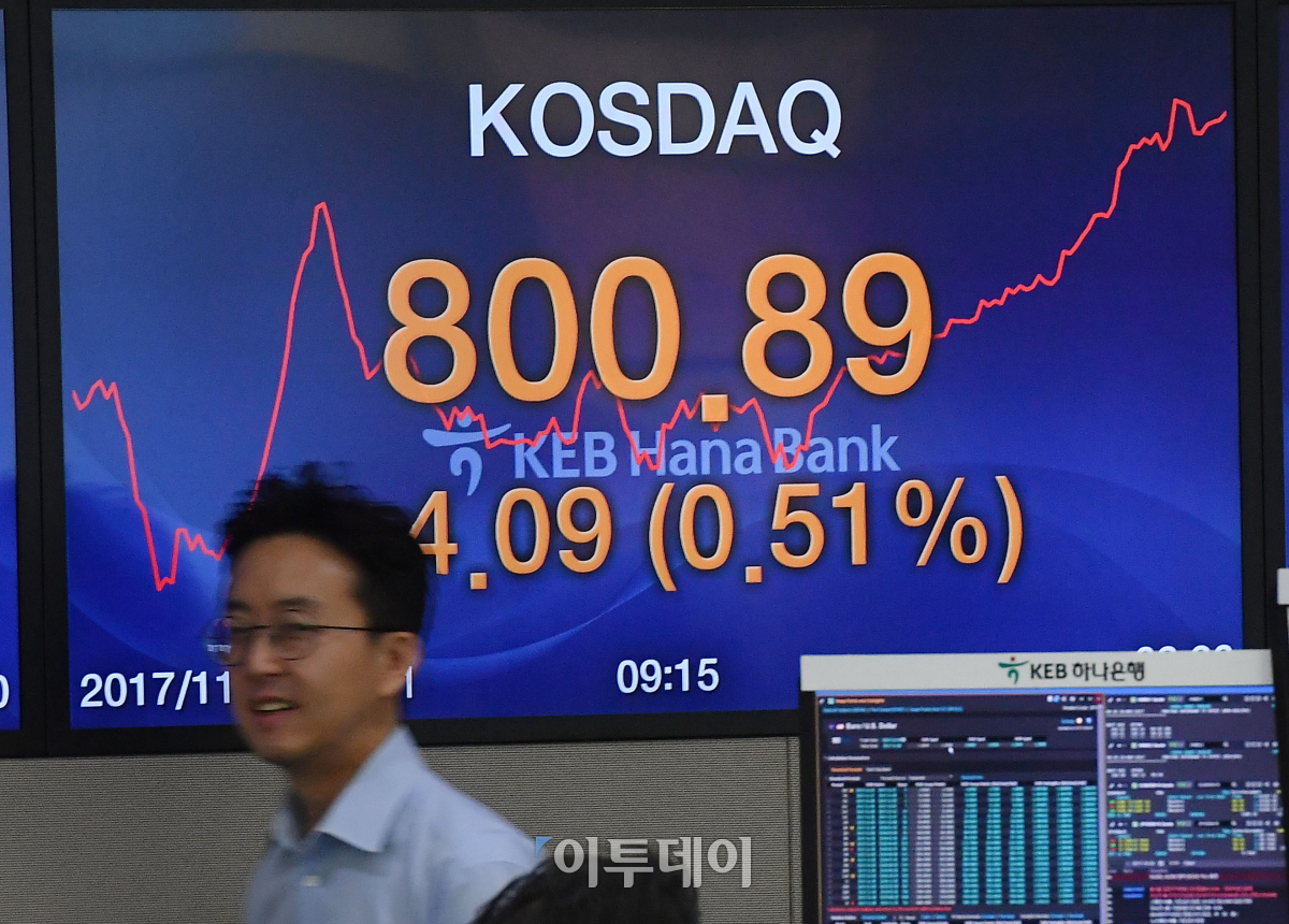 상승세의 코스닥 지수가 10년만에 800선을 돌파했다. 24일 오전 서울 을지로 KEB하나은행 딜링룸 전광판에 코스닥 지수가 전 거래일 종가보다 4.09포인트 오른 800.89을 나타내고 있다. 이동근 기자 foto@