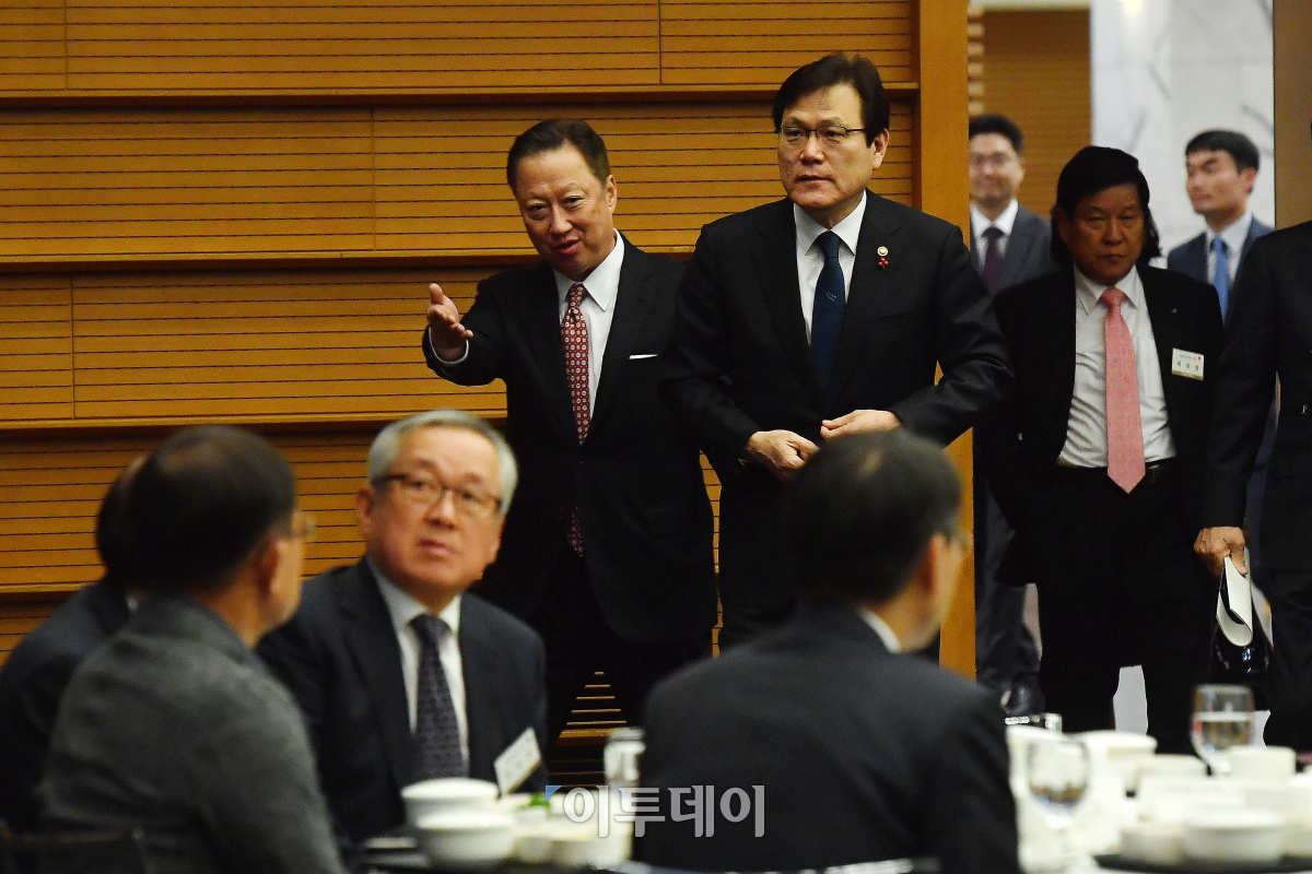 최종구(오른쪽) 금융위원장과 박용만 대한상공회의소 회장이 24일 오전 서울 중구 대한상의에서 열린 최 위원장 초청 간담회에 참석하고 있다. 이동근 기자 foto@