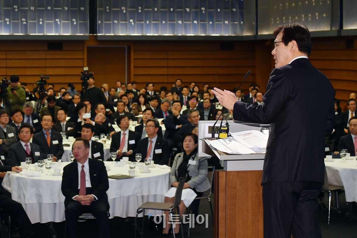 최종구 금융위원장이 24일 오전 서울 중구 대한상공회의소에서 열린 최 위원장 초청 간담회에 참석해 '품격있는 경제, 우리금융의 과제'를 주제로 강연하고 있다. 이동근 기자 foto@