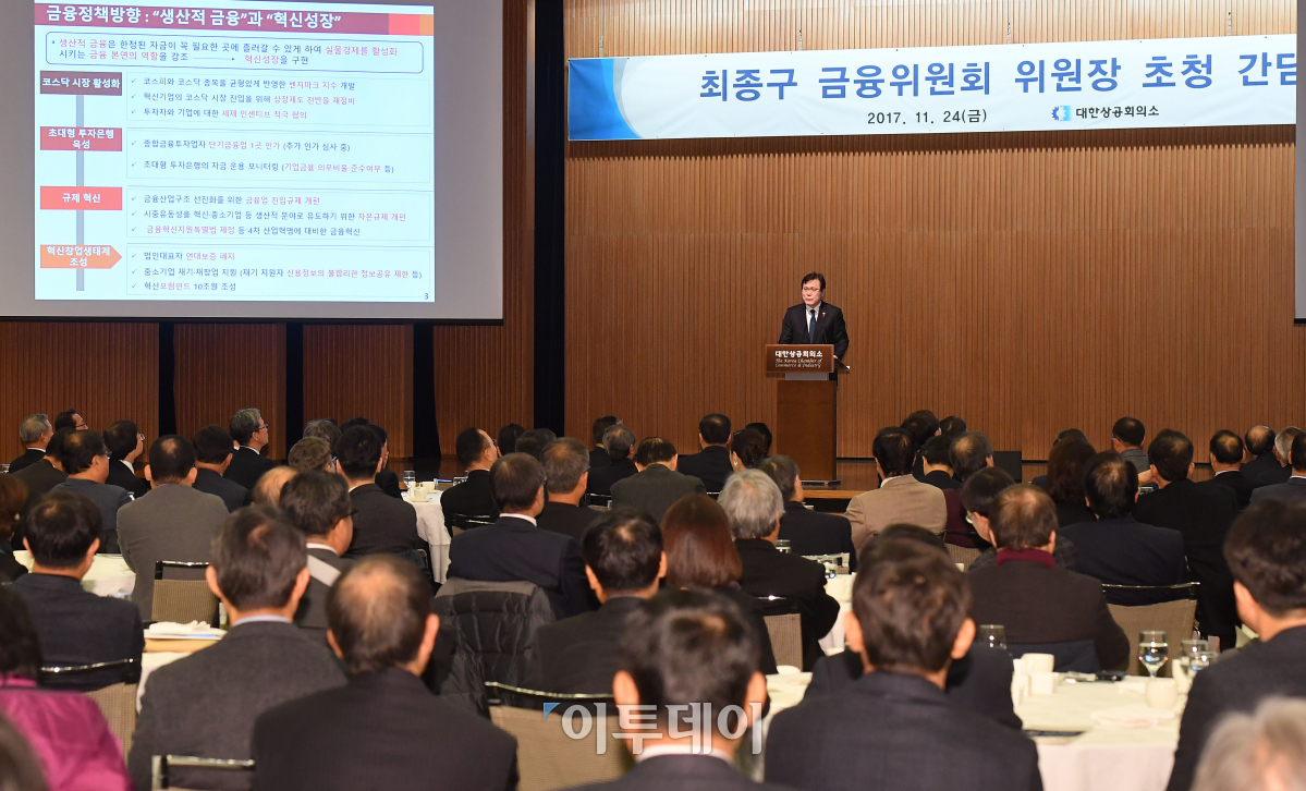 최종구 금융위원장이 24일 오전 서울 중구 대한상공회의소에서 열린 최 위원장 초청 간담회에 참석해 '품격있는 경제, 우리금융의 과제'를 주제로 강연하고 있다. 이동근 기자 foto@