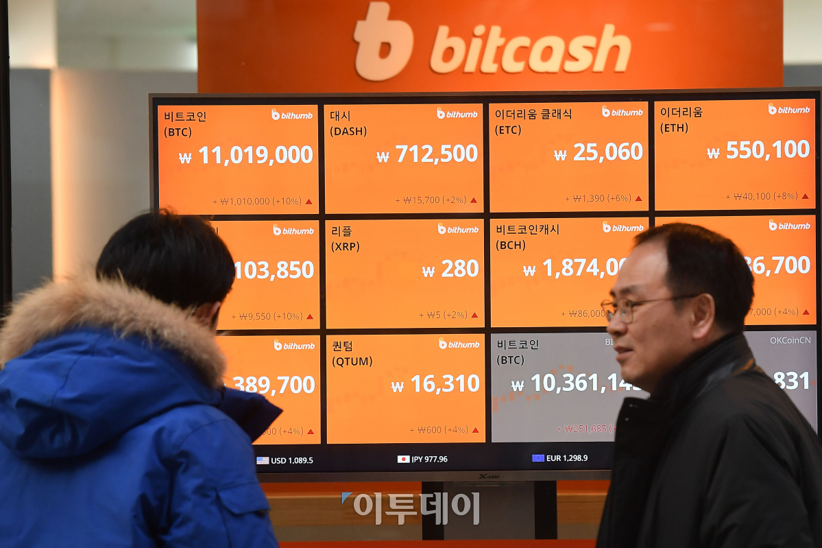 가상화폐 비트코인 가격이 사상 처음으로 9720달러 선까지 오르는 등 1만 달러를 향해 질주하고 있다. 27일 서울 중구 빗썸 가상화폐거래소 고객센터에서 시민들이 가상화폐 시세를 확인하고 있다. 이동근 기자 foto@