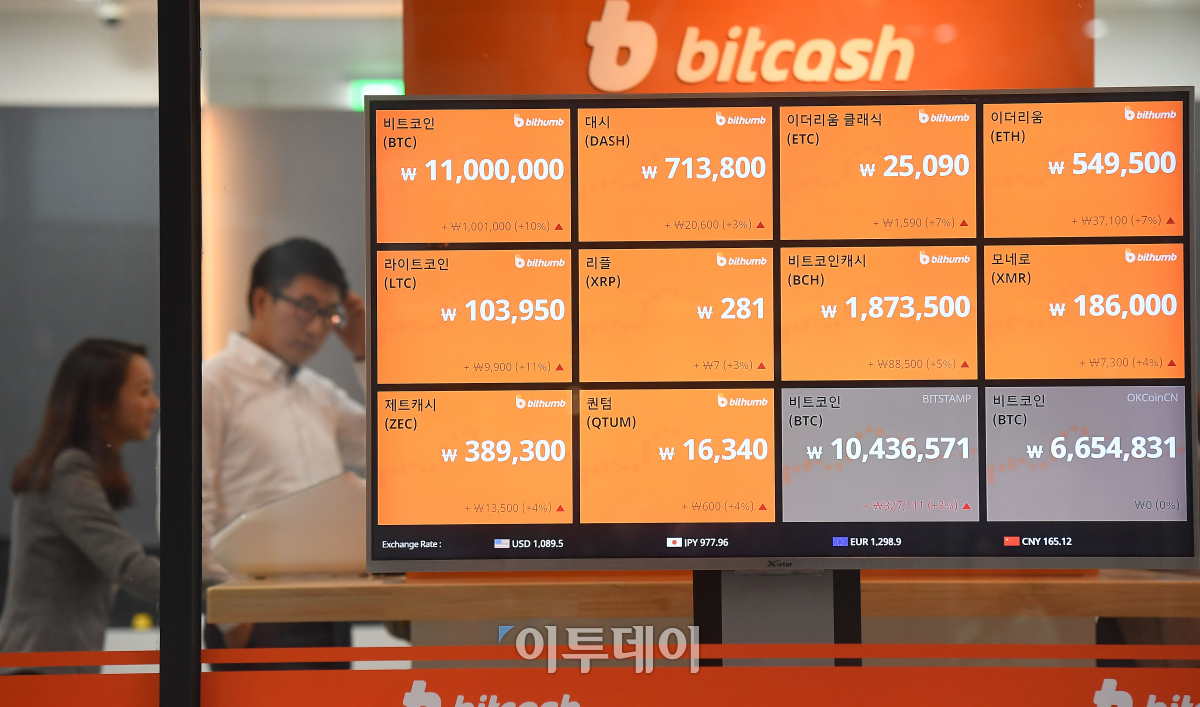 가상화폐 비트코인 가격이 사상 처음으로 9720달러 선까지 오르는 등 1만 달러를 향해 질주하고 있다. 27일 서울 중구 빗썸 가상화폐거래소 고객센터 에서 시민들이 거래를 하고 있다. 이동근 기자 foto@