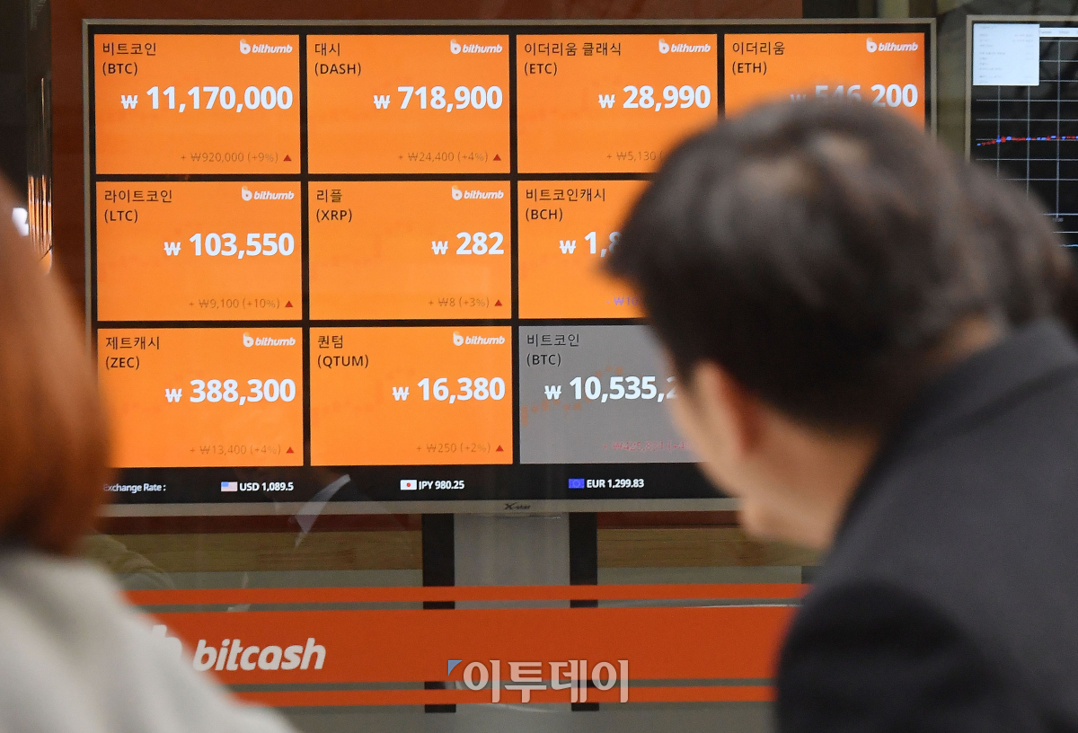 가상화폐 비트코인 가격이 장중 개당 9700달러 선을 돌파하는 등 올해 들어 전년 대비 9배 이상 폭등하며 1만 달러 고지를 눈앞에 두고 있다. 28일 오전 서울 중구 빗썸 가상화폐거래소 고객센터에서 시민들이 가상화폐 시세를 확인하고 있다. 이동근 기자 foto@