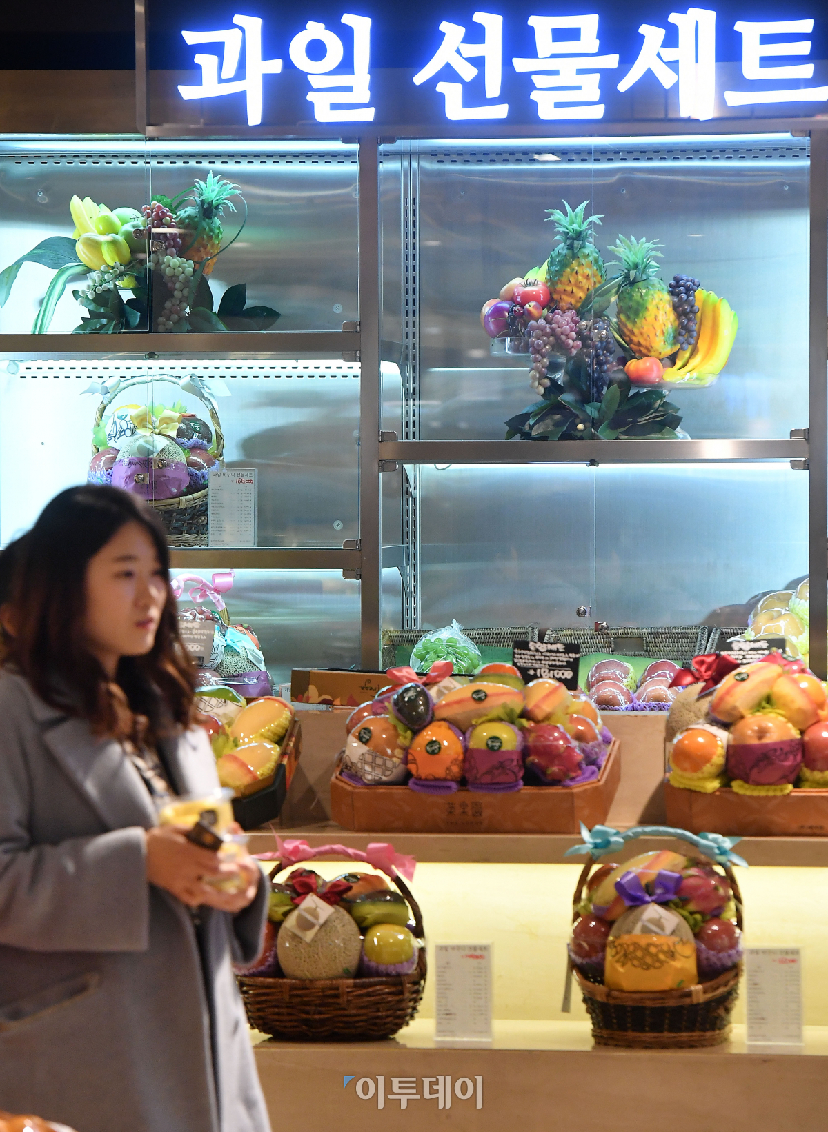 28일 서울 시내의 한 백화점 청과물코너에 과일선물세트가 진열돼 있다. 권익위는 지난 27일 전원위원회를 열고 농축수산품에 한해 기존 5만원에서 10만원으로 상향 조정하는 내용을 골자로 한 청탁금지법(일명 김영란법) 개정안을 부결 처리하며 제동을 걸었다. 이동근 기자 foto@