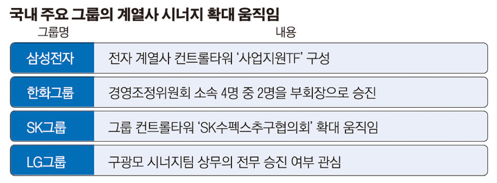대내외 경영환경 불확실성에 시달리고 있는 재계가 계열사 간 시너지 확보를 통한 탈출구 마련에 나섰다. 올 초 그룹 컨트롤타워 미래전략실을 해체한 삼성이 전자 계열사를 총괄할 사업지원TF를 새로 만든 것도 계열사 시너지 확보가 주목적이다. 한화는 사장단 인사를 통해 그룹 최고자문기구인 경영조정위원회에 힘을 보탰다. LG와 SK 등도 계열사 시너지 극대화를 위해 조직 및 인력을 강화할 것으로 전망된다.