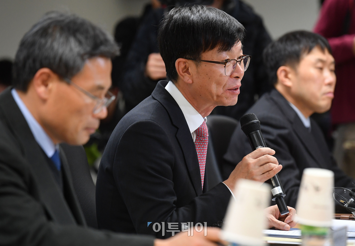 김상조(가운데) 공정거래위원장이 29일 서울 중구 공정거래조정원에서 열린 유통업계와의 간담회에서 인사말을 하고 있다. 이동근 기자 foto@