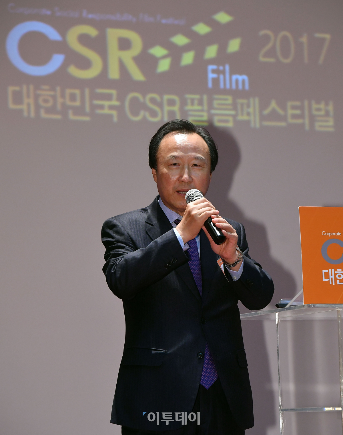 홍일표 국회 CSR정책연구포럼위원장이 30일 서울 여의도 사학연금회관 대강당에서 열린 대한민국 CSR필름페스티벌에서 축사를 하고 있다. 이동근 기자 foto@